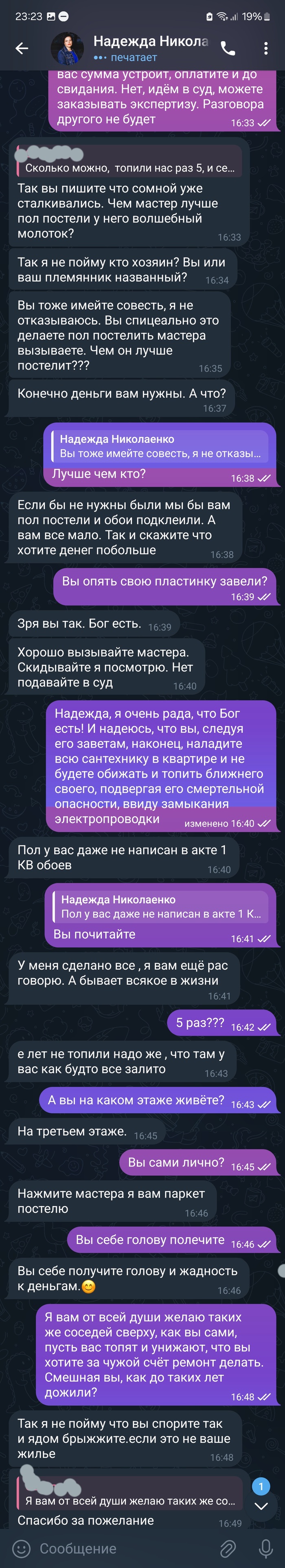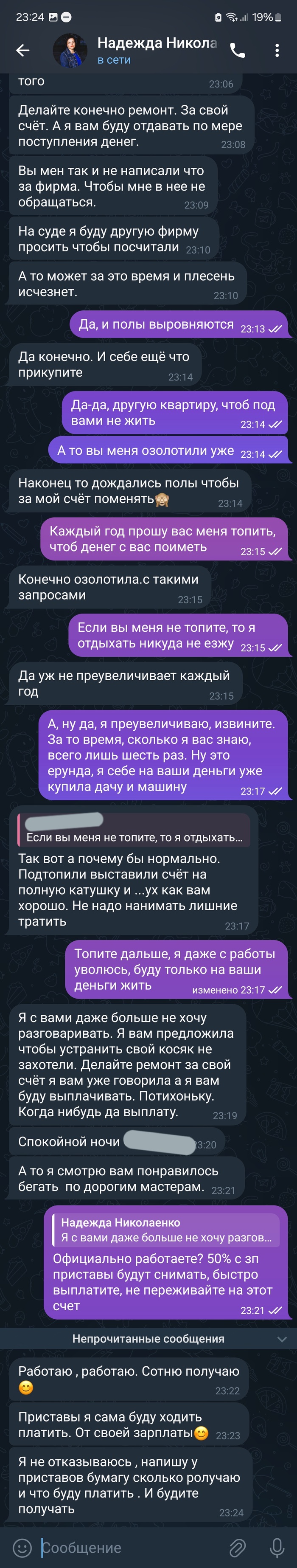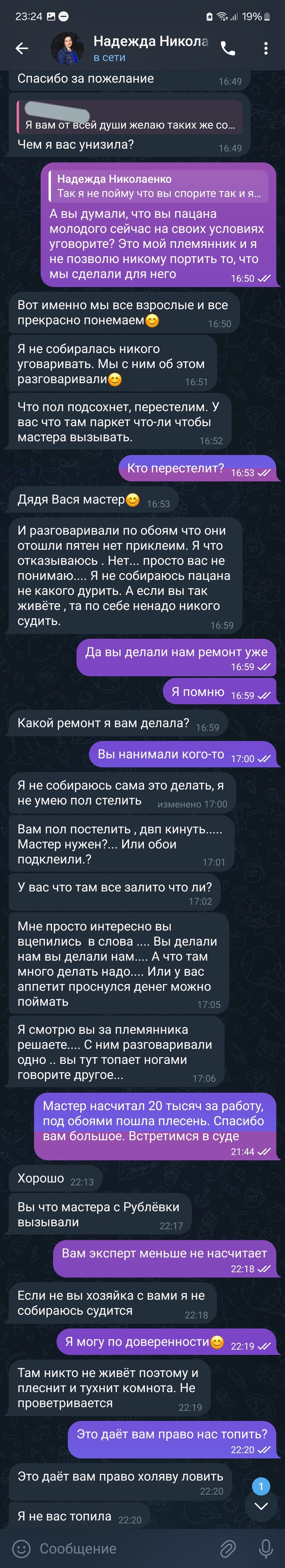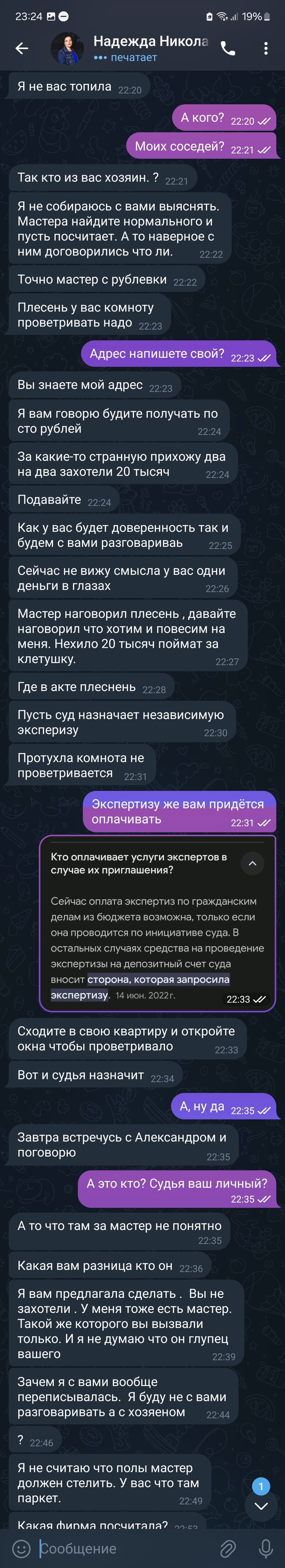 Затем мы съехали и сдали квартиру, было ещё пару мелких потопов, разошлись относительно миролюбиво, однако она всегда писала, что я хочу сделать ремонт за её счёт. Второй раз я подала в суд и настояла, чтоб она не делала ремонт сама. Она опять уломала судью и та надавила на меня, чтобы пришли какие-то её (соседки сверху) знакомые из официальной фирмы. Это был очередной трэшак, но мы пережили. Клеили они не лучше нее, но хотя бы вдвоём и немного быстрее.