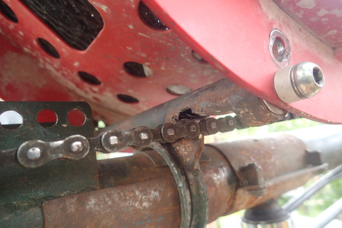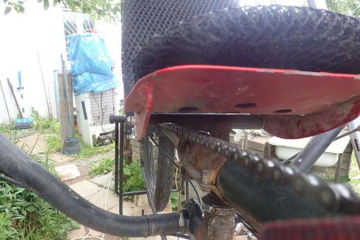 Оставив балбесу половину своей воды, я поехал в обратный путь, все было хорошо пока я не решил отпустит тормоза, разогнаться на все бабки с холма… Посреди дороги была довольно глубокая яма, свернуть не успевал так как увидел слишком поздно. Ну и не сбавляя хода решил перепрыгнуть данное препятствие. Переднее колесо то я поднял, а вот заднее не успел, оно со всего маху ушло в яму, дошло до дальнего края и там упершись в него резко устремилось вверх. Седло велосипеда со всего маху пнуло меня по анусай, ноги слетели с педалей, я со всего размаху прилетел в седло. Вот тут меня и чуть не начало телепать во сему полотну дороги, подседельный штырь сказал «я устал - я ухожу» и погнулся, на фото я его уже немного разогнул, по сути, я почти на покрышку сел.
