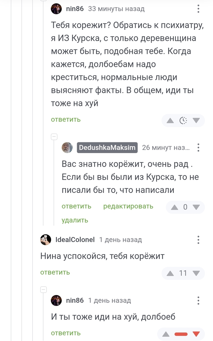 В комментариях к посту отметились уникумы, скриншоты с некоторыми сообщениями ниже И ведь кто-то из них реально живёт в нашей стране, ездит по нашим улицам и получает льготы от государства. Вот например nin86 (заблокировал меня) пишет что он или она из Курска.