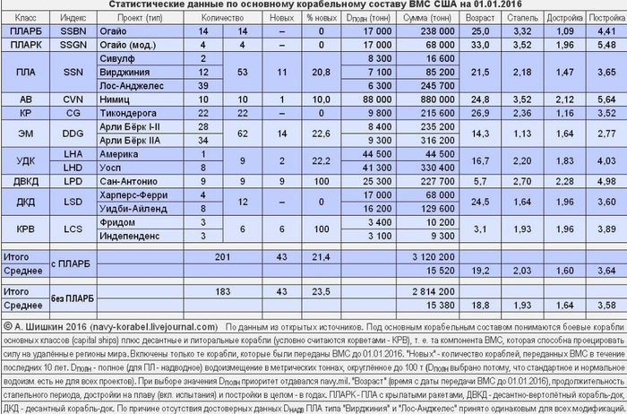 В настоящий момент американский флот имеет: 10 атомных авианосцев (плюс еще один новейший проходит сейчас процедуру передачи флоту); 22 атомных ракетных крейсера типа Ticonderoga; 65 эсминцев УРО типа Arleigh Burke; 44 атомные подводные лодки (в том числе 14 стратегических ракетных и 30 обычных ударных). Считать прочие суда особого смысла не имеет. Превращенные в демонстраторы технологий два эсминца типа Zumwalt, а также 6 постоянно ломающихся новых кораблей ближней зоны погоды не делают.