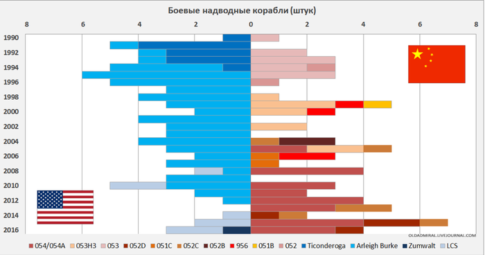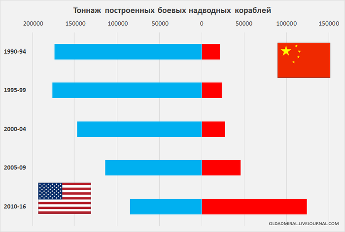 А вот что можно констатировать со всей определенностью — Китай резко ускорил темпы строительства военного флота в целом. Если в 2000—2004 годах он спускал на воду примерно по 20 тыс. тонн общего тоннажа, при американских 180 тысячах в год, то в 2005—2009 баланс сместился в 40/110 тыс. тонн, а с 2010 по 2016 на 130 тыс. «китайских» уже приходилось менее 80 тыс. «американских».