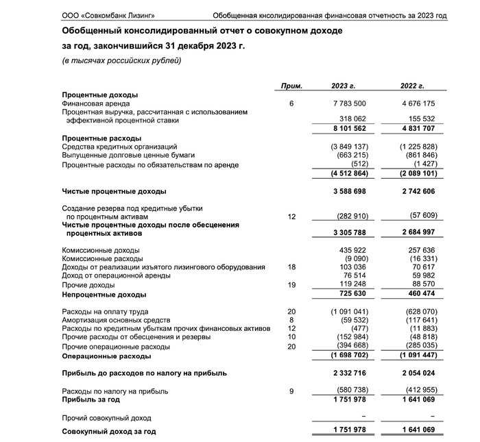 Бизнес диверсифицирован. 65% — это различный автотранспорт, также в портфеле строительное, промышленное, лесное и т. п. оборудование. Чистые инвестиции в лизинг (ЧИЛ) растут хорошими темпами. В 2022 году рост на 33%, а в 2023 — на 49%. При этом ROE держится на уровне около 30%.