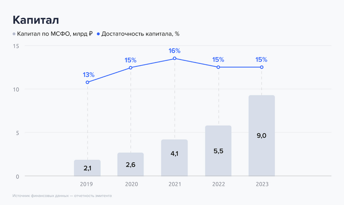 Компания сильно улучшила свои показатели в 2023 году, что прекрасно видно по МСФО. Чистая прибыль выросла на 38% до 8,82 млрд. Капитал вырос на 35% до 20,3 млрд. Процентные доходы выросли на 54% до 21,5 млрд.