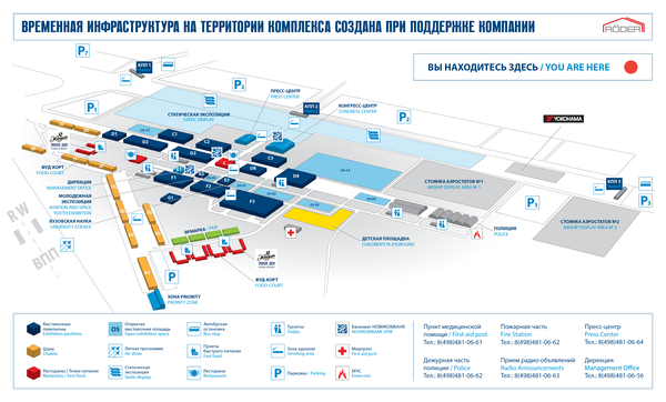Аэродром "Раменское" состоит из двух пересекающихся ВПП. Одна - самая длинная в Европе. Она - рабочая. По ней разбегаются самолеты во время авиашоу, она служит осью пилотажа. Вторая - нерабочая, покороче. На ней расставляют крупные самолеты. Между ВПП, на рулежках, стоянках и полянках организованы стоянки мелких самолетов, военной техники (комплексов ПВО например), павильоны и шале.