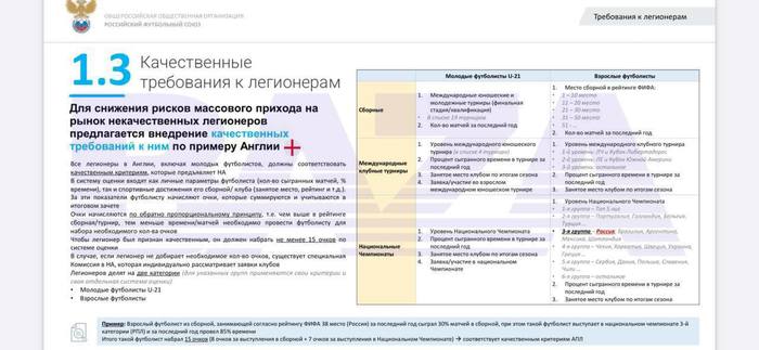 Есть и ограничения: функционеры предлагают ввести специальные тесты, как, например, в Англии, чтобы не привлечь в Россию «некачественных легионеров» – цитата по методичке РФС.