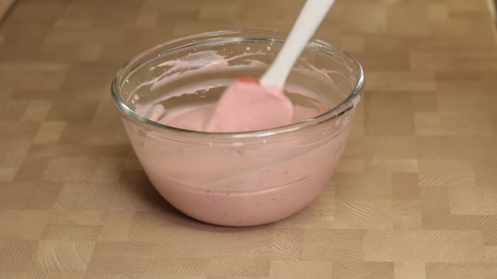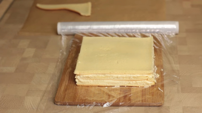 Готовый крем накрываю пленкой в контакт и оставляю остывать до комнатной температуры. Когда крем остыл, можно приступать к сборке.