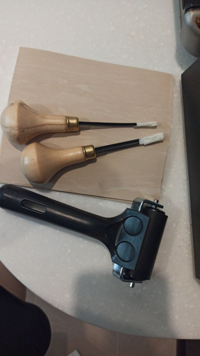 Материалы: бытовой линолеум, эпосидная смола, плёнка для обложки, поталь и клей для неё.