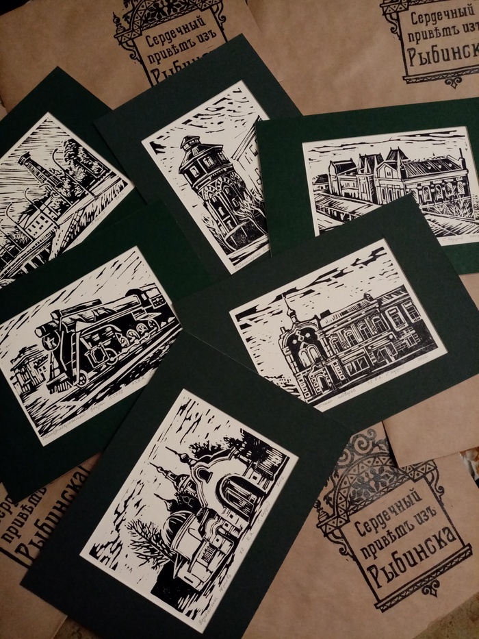 Первой моей серией работ в этой технике стали открытки с видами г. Рыбинска. Каждая оформлена в паспарту и упакована в конверт, на который тоже нанесена печать.