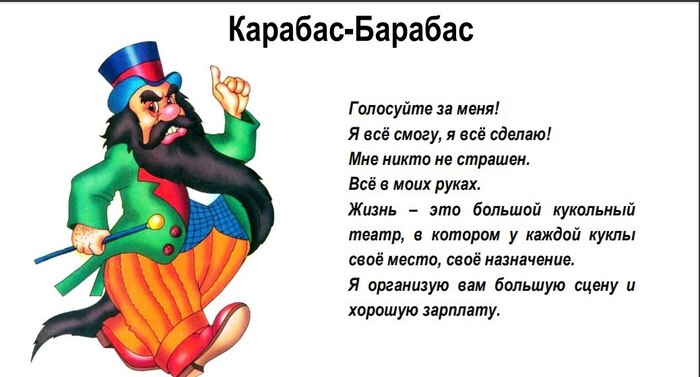Каждому избирателю - воздушный шарик, а лешего заставят работать. Такие предвыборные обещания дали Карабас-Барабас, Золушка, Винни-Пух, Лиса Алиса и Баба-яга.