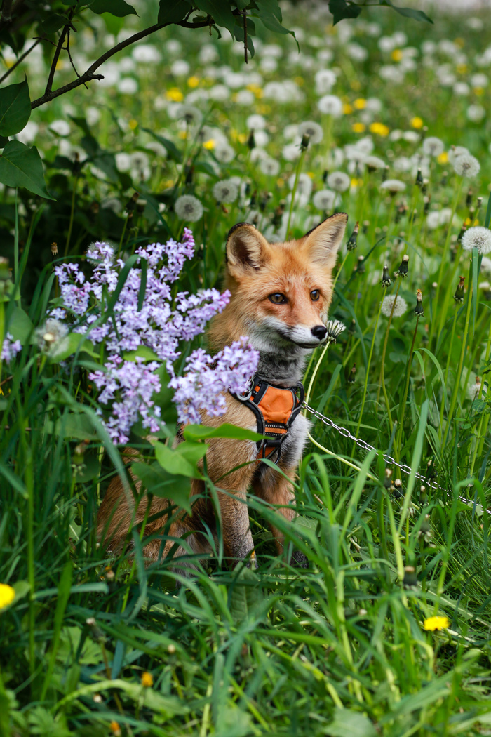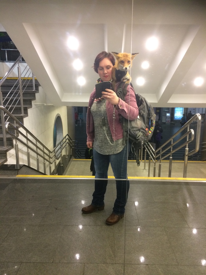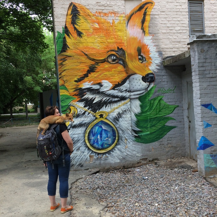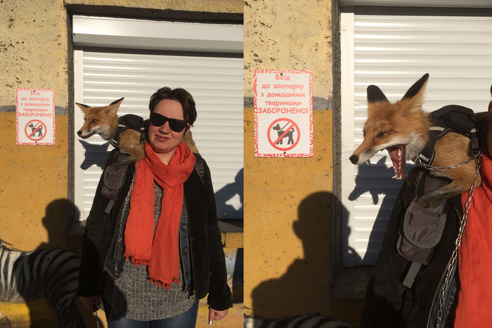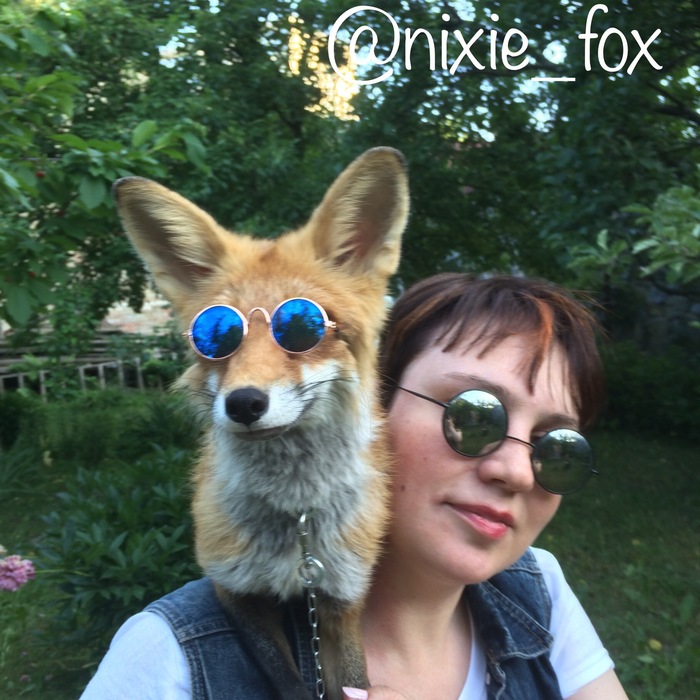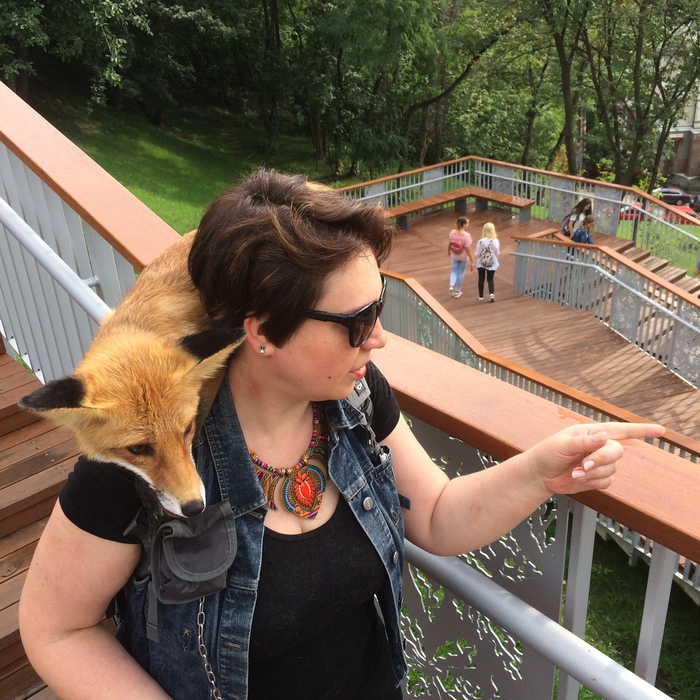 Лисички любят ездить на плечах. Когда Никси была маленькая, то она сама залезала мне на плечи, удобно устраивалась и можно было так идти с ней куда-то. Знаю не одну такую лису, которые спокойно могут лежать на плечах хозяина. Лисица опирается задними лапами на рюкзак или капюшон, а передними на плечо.