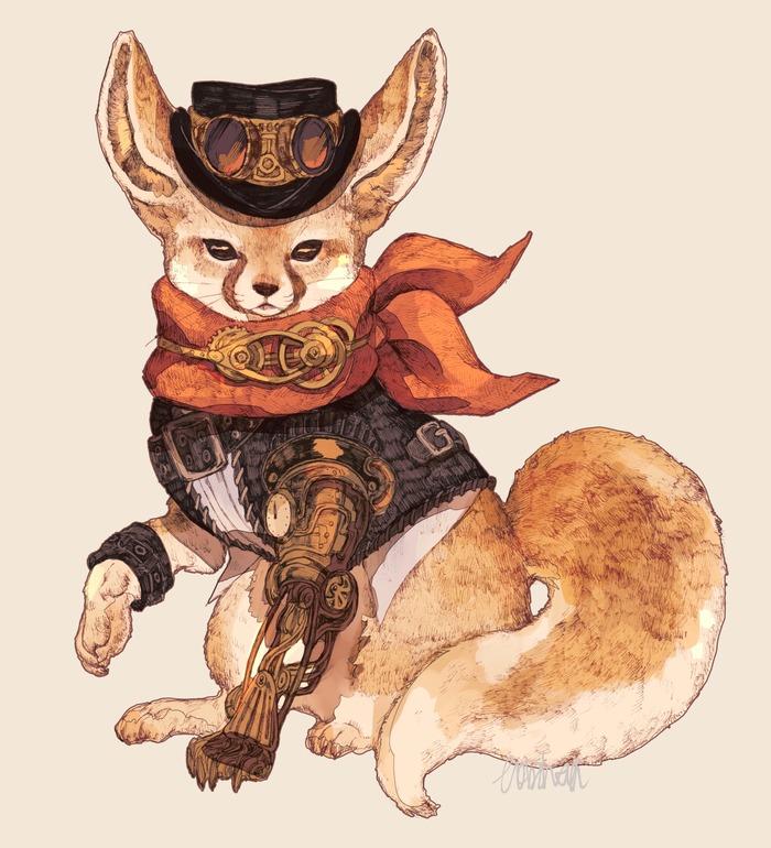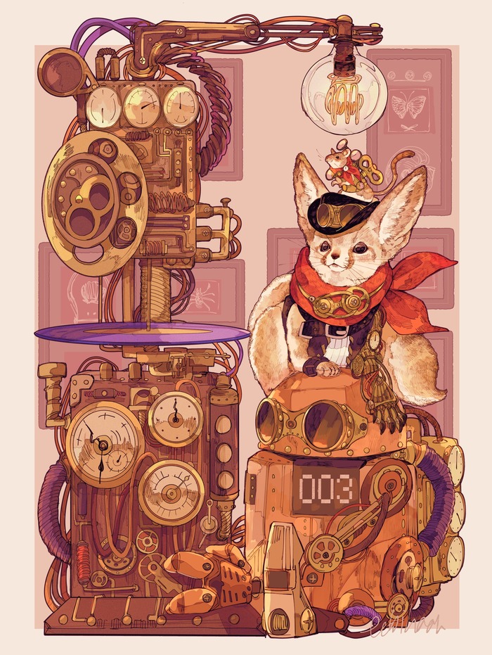 Лиса в стимпанк-костюме среди паровых механизмов, атмосферный свет, детализированное фото