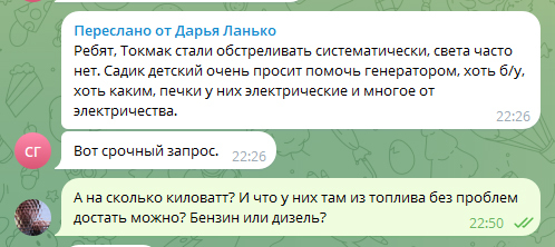 Населенный пункт регулярно подвергался обстрелам и с электричеством там очень нестабильно все. Покупать генератор в Питере и тащить его на Запорожье довольно долгая история. Нашли где купить его в Таганроге и оперативно доставить в Токмак.