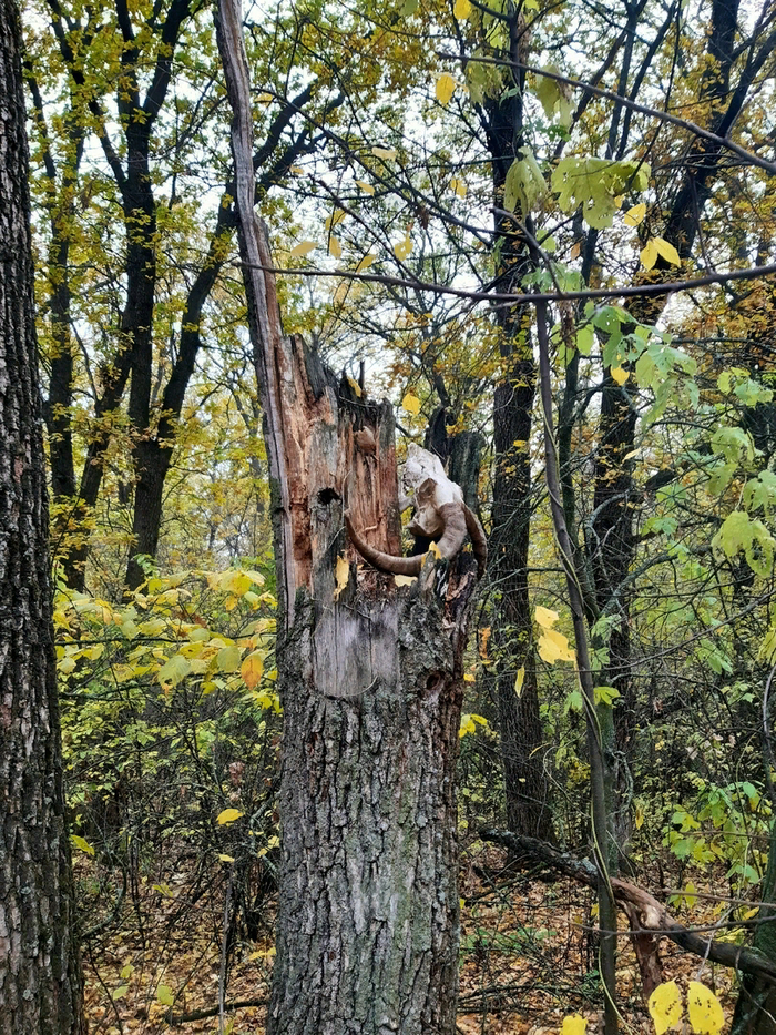 Вдруг увидел череп животного на стволе обломанного дерева, наверное грибники повесили. Предполагаю что он принадлежал косуле, лично видел их здесь, рядом валялись мелкие кости от остального тела.