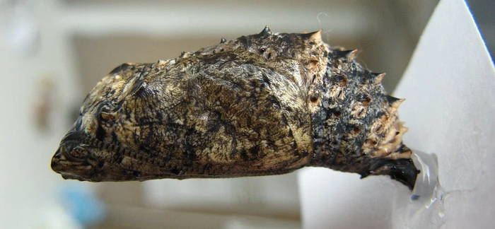 Следующая стадия — куколка. Она ничего не ест, зато прекрасно маскируется. Текстурой и формой кокон напоминает кору того дерева, на котором зависает. Спустя 10-15 дней из неё вылезает полноценная бабочка.