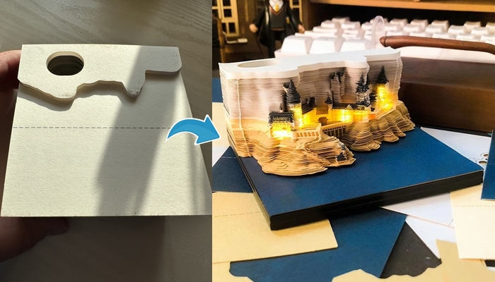 Очень креативный блок с отрывными бумажками для заметок из 170 штук и подставкой для ручки. Когда будут оторваны все листы до уровня 'моря', то образуется мини-диорама с замком. Ссылка на блок, там же можно найти множество других сюжетов.