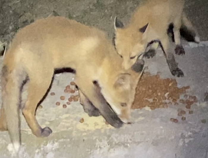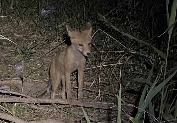 Лиса выкопала нору практически в городе. Сколько родила не знаю. Двух наглых, которые научились на теплотрассу диаметром около 0,4 метра залазить и бегать по ней, увидел первыми. Потом у норы четверых. Каждый вечер их наблюдал. Сейчас пары глаз по степи отражают свет фонаря. Но один лис у норы так и тусуется. Храбрости ему, что-ли, не хватает.
