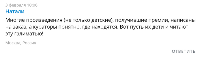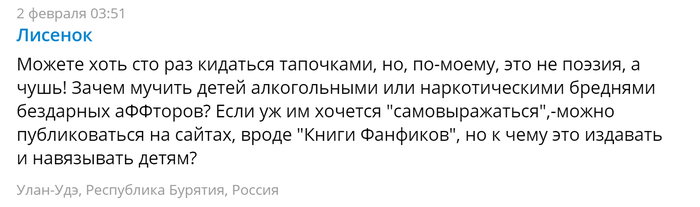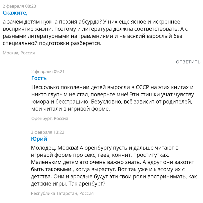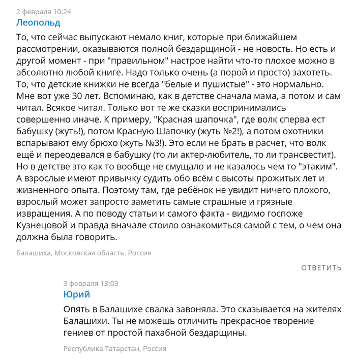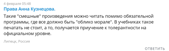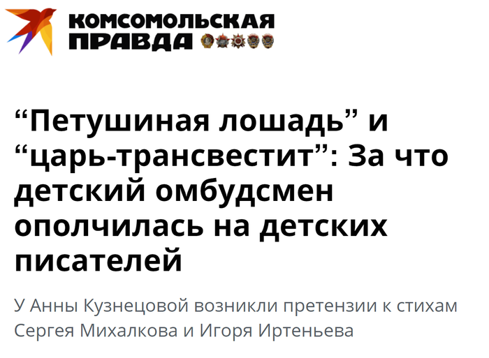 Сейчас будет странное заявление: В Комсомольской Правде есть адекватные люди. В этой статье, например, подробно разбирается почему придирки омбудсмена по правам детей Анны Кузнецовой к стихам Михалкого и Иртеньева - совершенно идиотские.