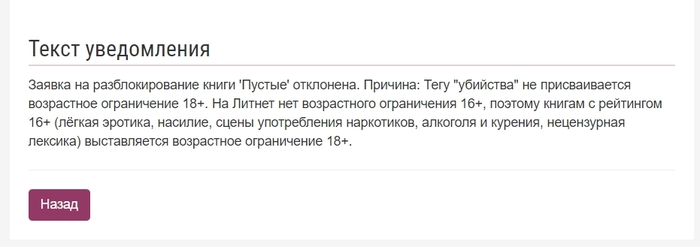 Посмотрела какие теги популярны (ну не зря же они там указываются), указала «ангст, убийства» вместо «подростки, секты, птср». И тут мой взгляд падает на красивенькую такую розовенькую плашечку 18+. И я такая «Дратути, а откуда мы тут взялись?» Возвращаю теги обратно, плашка не исчезает. Ясно-понятно, пишем в поддержку. Время ночь, так что ответ будет утром.
