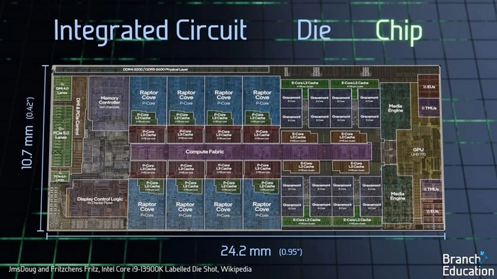 Рассмотрим строение чипа на его примере. Данный процессор содержит восемь больших ядер и 16 малых, крупный кэш третьего уровня, контроллер памяти с поддержкой DDR4 и DDR5, встроенную графику UHD770 и прочие функциональные блоки. При этом размер кристалла такого чипа всего 10.7х24.2 мм.