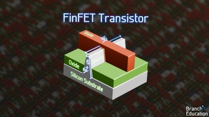 В современных процессорах используются трехмерные транзисторы FinFET. При технологии производства Intel 7 (10 нм), размер канала транзистора составляет 36 × 6 × 52 нм, а шаг между затворами транзисторов — 57 нм.