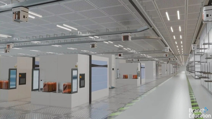 Пластины перевозятся стопками по 25 штук в специальном герметичном контейнере (FOUP), которые передвигаются по производственному помещению благодаря подвесной транспортной системе. С нее контейнеры опускаются на загрузочную площадку принимающей установки.