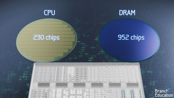 Таким образом наносятся и обрабатываются 80 различных слоев. После окончания обработки из одной пластины могут получится 230 центральных процессора или 952 чипа оперативной памяти.
