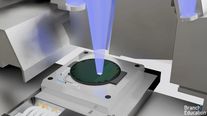 Самый интересный элемент этой связки — литографический сканер. Внутри него находится источник ультрафиолетового света, который работает в связке с трафаретом соединений. Трафарет имеет размеры около 15×15 см. На одном трафарете могут находиться схемы сразу двух слоев чипа. На небольшие поверхности будущих чипов свет через трафарет попадает посредством сложной системы линз, которая уменьшает изображение в четыре раза.