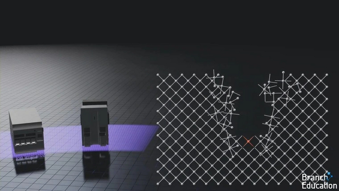Бомбардировка осуществляется вместе с нанесенной маской, поэтому затрагивает только определенные места на пластине. По сравнению с методом осаждения этот способ добавляет гораздо меньшее количество материала. Все потому, что в первом случае материал распыляется потоком, а во втором происходит только точечный заброс атомов в кремниевую решетку.
