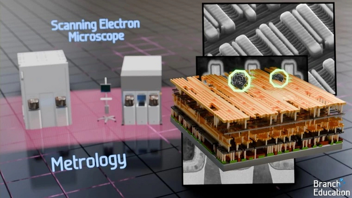 Метрологические инструменты — устройства для проверки транзисторов и металлических слоев на наличие дефектов. Они представляют собой мощные электронные микроскопы, которые делают снимки слоев и сравнивают их с эталонными, чтобы определить возможные дефекты или наличие посторонних частиц.