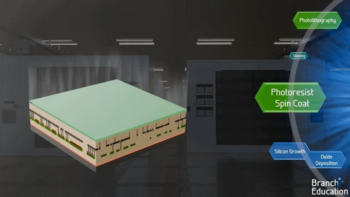 Первым делом на пластину наносится слой изолятора — диоксида кремния. Затем по поверхности распределяется фоторезист, и пластина подвергается термообработке для его усадки.