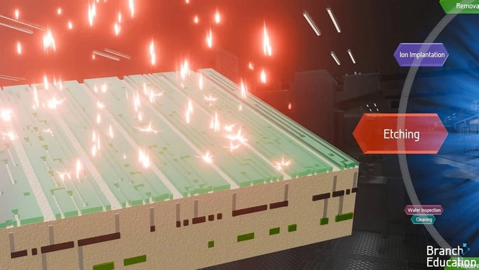 Затем в дело вступает инструмент для травления, который «стачивает» изолятор. На первом слое это происходит до глубины, которая достаточна для формирования транзисторов. На последующих — до тех пор, пока не станут доступны металлические переходы от нижнего слоя.