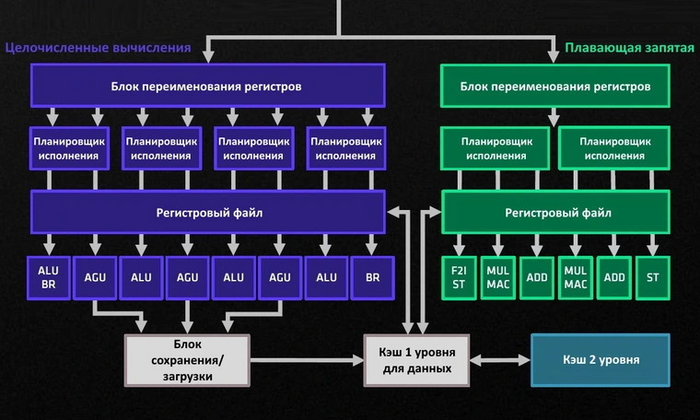 Усовершенствованный FPU расширился с четырех блоков до шести. Теперь у него два планировщика вместо одного.