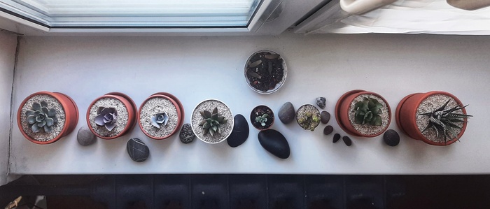 Суккуленты стали стихийно появляться на моем подоконнике и сейчас их уже гораздо больше, к тому же , сейчас они на зимовке и сад-дзен на подоконнике временно пришлось превратить в гм...нечто, залепленное скотчем и старыми футболками- капец как дует у меня с этого окна. Зимуют они под фитолампой полного спектра, средняя t° где-то 17-19°. Полив периодический, какого-то графика нет, просто вижу что "сморжопились" листы у кого-то - поливаю. Многие перецвели под 12 часовым освещением.