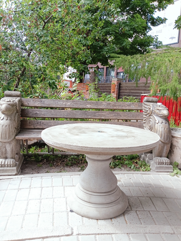 Стол разборный, из трёх частей, вставленных друг в друга. По центру изделие имеет отверстие под зонт.
