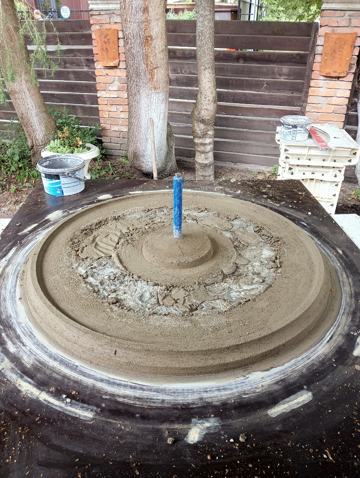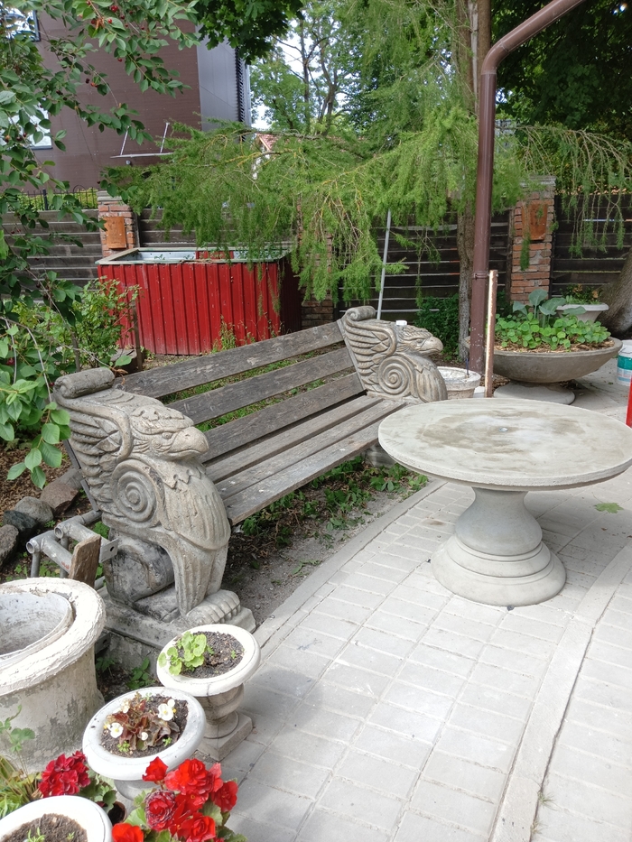 Грифоны старше, модель была сделана из газоблока и отформована. На фото бетонные отливки по 180кг каждая. Под грифонами фундаменты, чтобы не утонули в грунте.