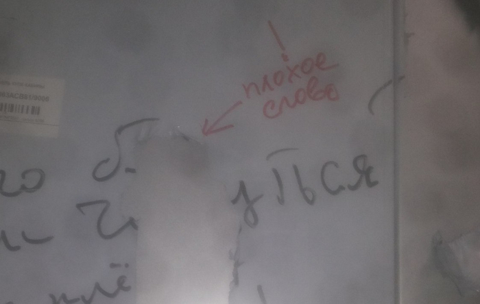 Лифт в новостройке, новый, весь в плёнке на которой объявления маркером типа СТРОИТЕЛИ! ОТДЕЛКА! ГРУЗЧИКИ! ВЫВОЗ МУСОРА! СТЯЖКА ПОЛА!!! и тд, среди всего этого заметил такое: