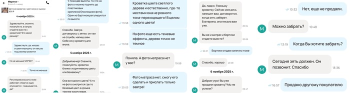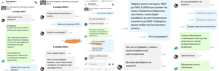 На третий день они решили отправить отца ребенка забирать кроватку, адрес узнали, номер телефона, чтобы он договорился о встрече. К слову, он так и не позвонил. Но когда Екатерине сообщили, что кроватка в собранном состоянии и покупателям нужно раскрутить ее шестигранником(5 минут) и самостоятельно вынести, Екатерину это не устроило. «Вы сами разобрать не можете?».