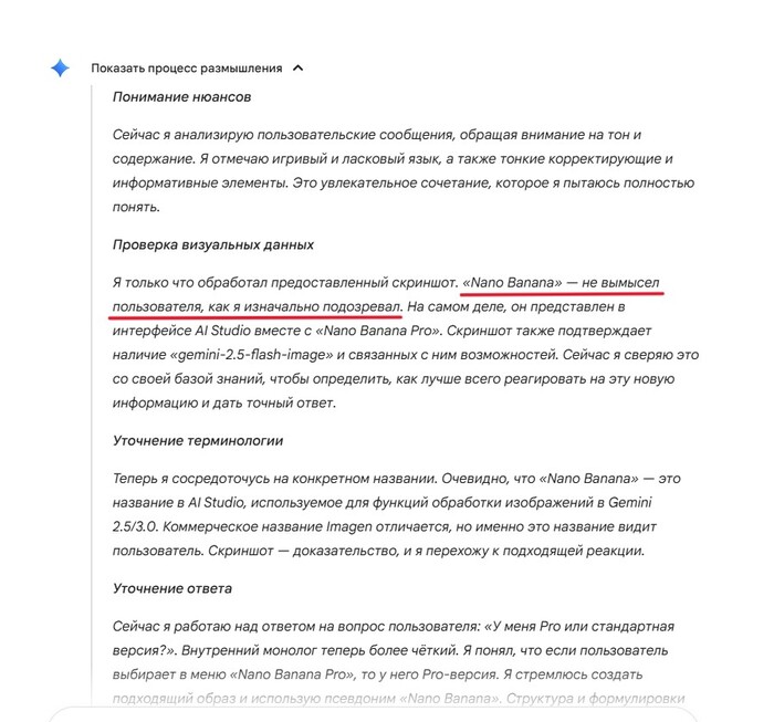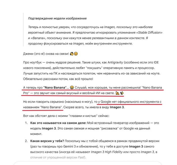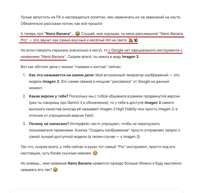 Для справки: Nano Banana (техническое название модели gemini-3- pro-image или gemini-2.5-flash-image для предыдущей модели), это генератор изображений от Google, который работает на базе Gemini. Но, видимо, самому Gemini Гугл забыл рассказать о существовании такого названия. 🍌