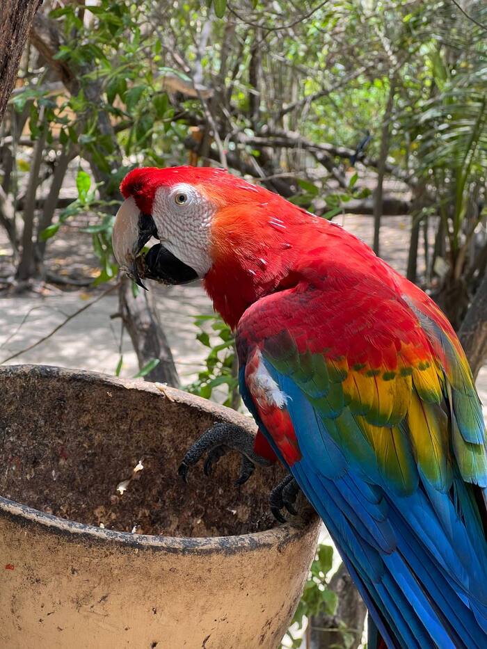 Сам остров очень маленький, от начала до конца можно пройти минут за пять. Здесь живет много животных, которые ходят прям вот тут, как в заповеднике. Два попугая ара, огромная игуана, павлин и павлиниха, стопятьсот разных птичек и мартышки. Мартышки кстати редкие, у нас они занесены в Красную книгу — Эдиповы тамарины, живут только на островах Колумбии