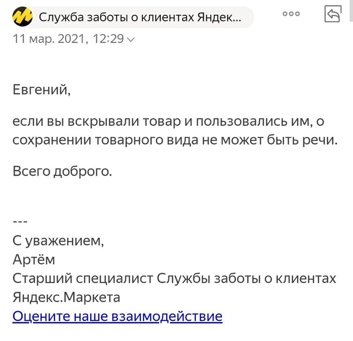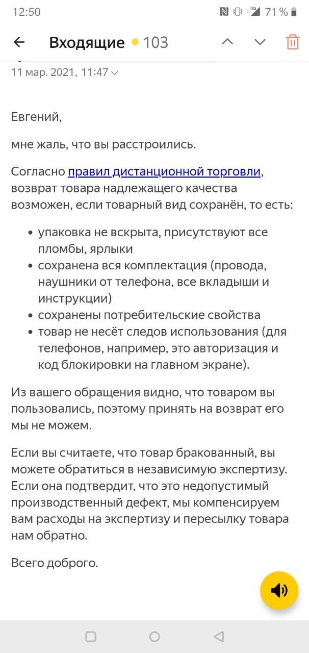 Ну я еще раз позвонила в ЯМ, прикинулась тупой пенсионеркой, сделала вид, что я еще только собираюсь что-то купить, задала все вопросы насчет "разрезания ленточки", "товарного вида" и прочей лабуды и записала разговор со всеми ихними "дадада, конечно не будет проблем с возвратом, если вам товар не подойдет/ не понравится".