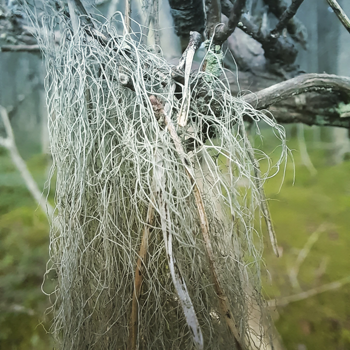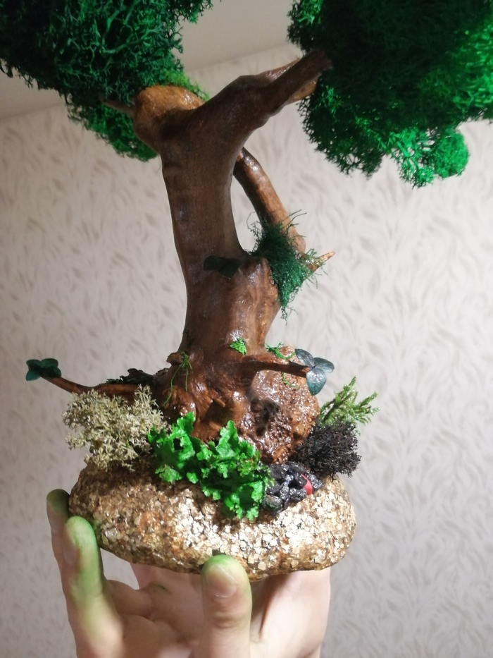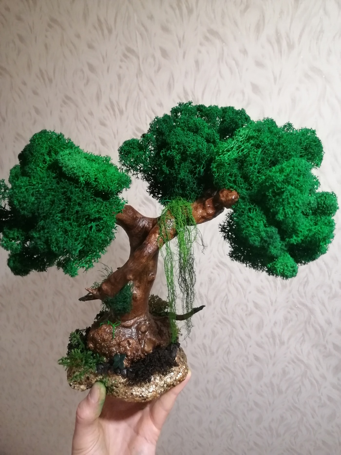 Берём кусок проволоки, обматываем бечевкой, придаём форму ствола дерева. Сверху одеваем кусочек живого мха или лишайника (цетрария, кладония, ягель, исландский мох и т.п.) Если периодически опрыскивать, будет стоять запах моря, водорослей или леса. Который, в свою очередь ещё и очищает воздух, наполняет его полезными микроэлементами. Эти лишайники используют для лечения многих заболеваний, так что их даже есть можно. Если ребёнок или животное решит полакомиться, не страшно. Ну а если нет ни мхов, ни лишайников, можете создать чисто визуальное украшение, надев что-то неживое, например гортензию.