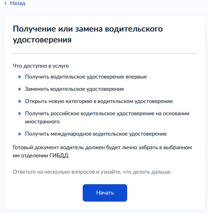 На следующей странице показывается информация об услуге с водительскими удостоверениями, которую можно получить. Одним из пунктов идет замена водительского удостоверения. Это нам и нужно. Нажимаем «Начать».