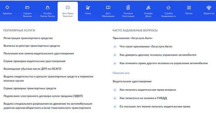 На главной странице портала вверху находим вкладку «Авто Права Транспорт». Чтобы найти данную вкладку в мобильном приложении нажимаем «Услуги».