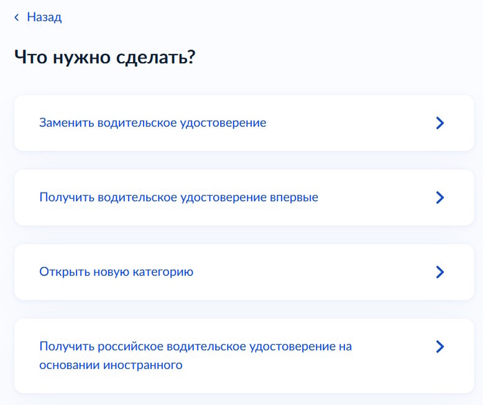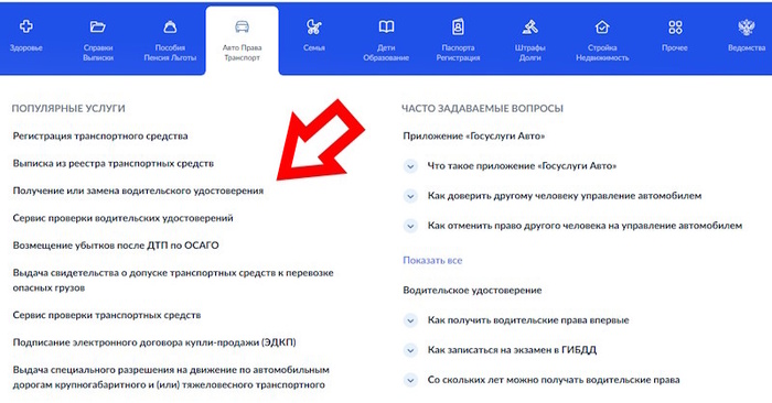 Далее выбираем «Получение или замена водительских удостоверений».