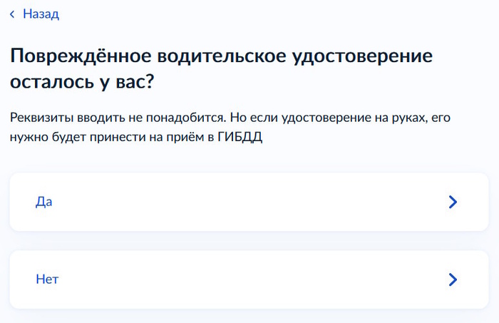 После чего у нас спрашивают, а имеется ли у вас на руках водительское удостоверение, которое повреждено. Мы отвечаем в нашем примере утвердительно, «Да». Если на руках у вас нет прав, то нажимаете «Нет».