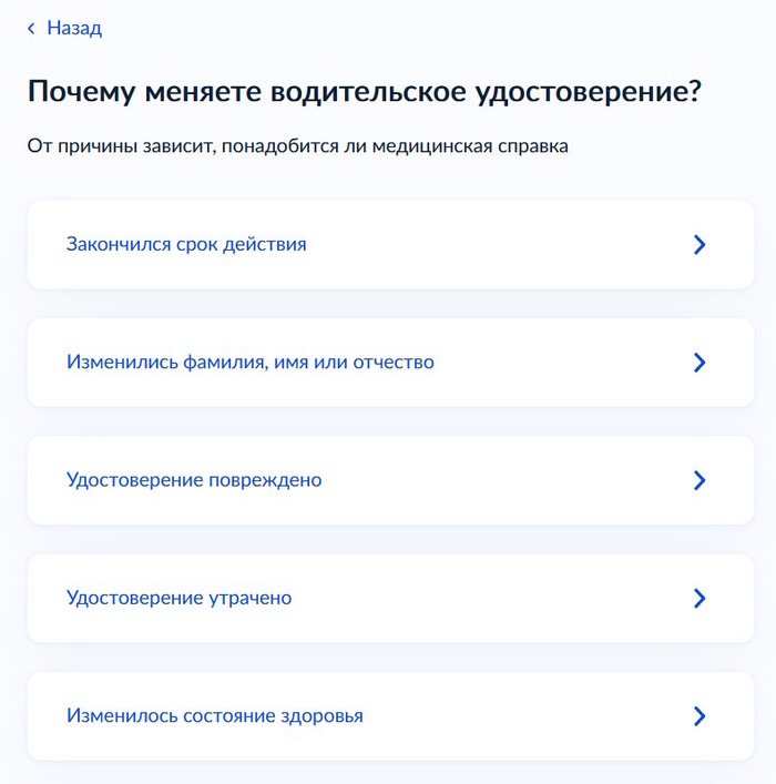 Чтобы получить услуги мы должны выбрать пункт, который подходит под нашу ситуацию. Мы должны указать, почему мы хотим поменять водительское удостоверение. Мы, для примера, выберем вкладку «Удостоверение повреждено».