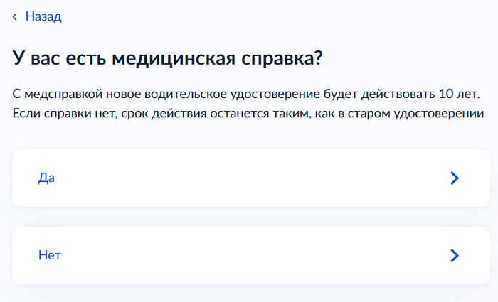 Здесь вы делаете выбор в зависимости от того, есть ли у вас медицинская справка (действующая). У нас ее нет. Мы выбираем «Нет».