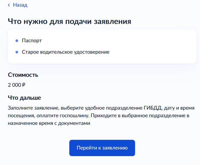 Далее указана информация о документах, которые необходимы для подачи заявления и записи в ГИБДД. На рисунке указана госпошлина, которая действует на момент составления данной инструкции. Она может увеличиться, когда вы решите поменять права. Нажимаем «Перейти к заявлению».