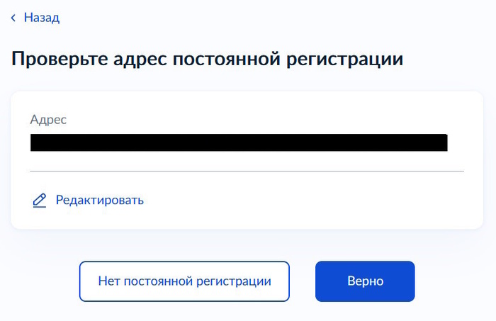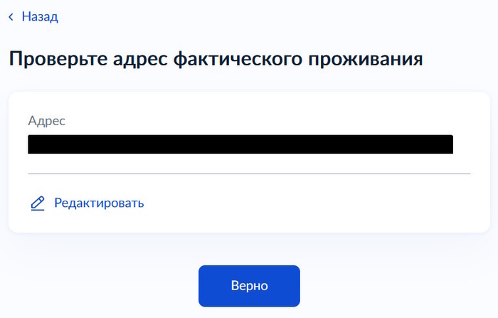 Затем проверяем адрес постоянной регистрации и адрес фактического проживания. Если все верно нажимаем «Верно». При необходимости можно отредактировать данные.