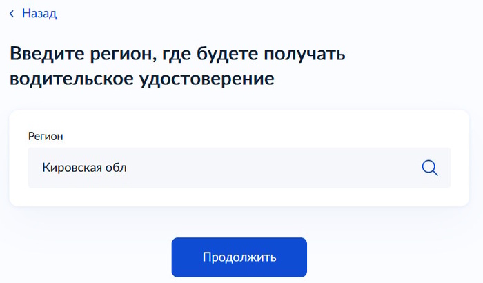 Далее выбираем регион, где вы желаете получить водительское удостоверение. Мы выберем Кировскую обл. Отметим, что данную услугу можно получить в любом регионе страны. Здесь нет привязки к месту прописки или проживания. Нажимаем «Продолжить».